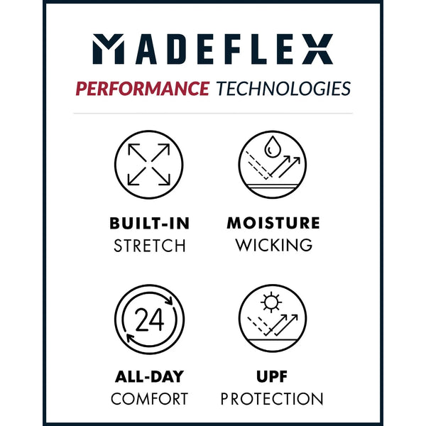 MadeFlex Performance Technologies: Built-In Stretch; Moisture-Wicking; All-Day Comfort; Easy Care