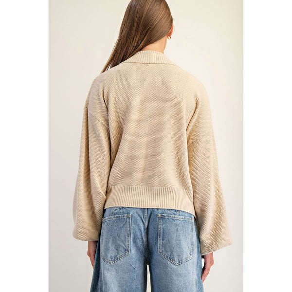 - Features a seed stitch knit texture, dropped shoulders, bubble sleeves, ribbed trim at the cuffs and hem, and a relaxed, slightly cropped silhouette for a cozy yet structured feel