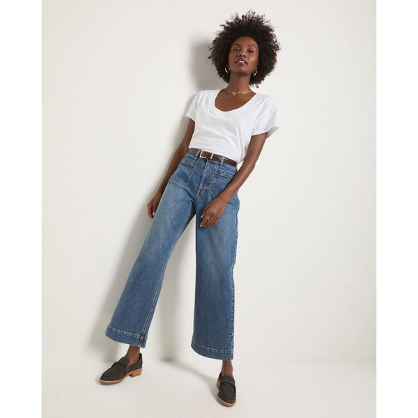 - These high-rise, wide-leg cropped jeans are cut from sturdy cotton denim with no stretch and serious shape. Patch pockets add vintage charm. Stylized wide hems bring a little extra kick.